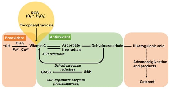 The redox pair vitamin C/DHA. The antioxidant vitamin C is oxidised first to the ascorbate radical and then to DHA which are both reversible reactions due to the enzymes AFR reductase and DHA reductase which relies on GSH as a co-factor. With continued oxidative stress, DHA undergoes an irreversible rearrangement to diketogulonic acid which is linked to accelerated protein cross linking and cataract formation. Vitamin C can also act as a pro-oxidant by reducing metal ions that generate free radicals through the Fenton reaction.