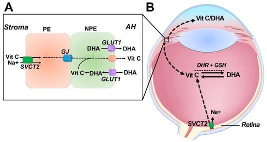 In the human ciliary epithelium, vitamin C uptake from the stroma is mediated by the Na+ dependent vitamin C transporter, SVCT2 [74] which was shown to be expressed in the PE [13]. From the PE layer, vitamin C is proposed to diffuse via gap junctions to the NPE (Figure 4A). However, it is unknown how vitamin C in the NPE is transported into the anterior chamber, suggesting unidentified active transporters must be involved. DHA can also be secreted by the NPE cells given that the facilitative glucose transporter GLUT1, the major transporter of DHA (and glucose), is expressed in the NPE layer [13]. However, it has been suggested that the concentration gradient for DHA would most likely suggest that the function of GLUT1 in NPE cells is for the local recycling of DHA back to vitamin C in which DHA is taken up from the anterior chamber into the ciliary epithelium where it is regenerated to vitamin C and then secreted back into the aqueous. In other animals, it should be noted that vitamin C transporter expression is different [13]. In the mouse eye, there is an absence of SVCT2 in the ciliary epithelium, but high expression of SVCT2 in the retina suggesting that the retina is the more likely source of vitamin C in the vitreous for nocturnal animals [13]. This may explain the lower levels of vitamin C in the aqueous humor in mice compared with diurnal species such as humans.