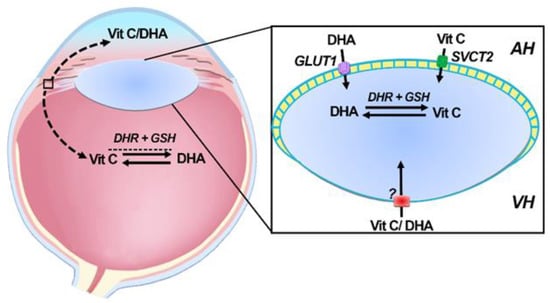 Although DHA in the aqueous humor constitutes only about 10% of total vitamin C content, it is DHA which appears to be preferentially transported into the lens and then recycled back to vitamin C [79]. This accumulation is mediated by facilitative glucose transporters of which GLUT1 has been shown to expressed in the epithelium and fiber cells of human donor lenses [80]. While the lens is presumably able to source vitamin C and/or DHA from vitreous humor (Figure 5), it is unknown whether SVCT2 and GLUT1 are expressed at the posterior surface of the lens in order to facilitate this.