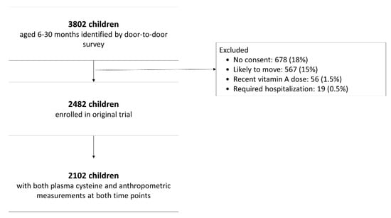The following are available online at https://www.mdpi.com/2072-6643/12/10/3146/s1, Figure S1: Density plots for height-for-age (HAZ), weight-for-height (WHZ) and weight-for-age (WAZ) for study children with available plasma total cysteine (tCys) (solid line) and missing tCys (dashed line).