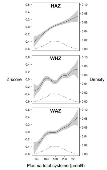 The GAM plots in our work (Figure 2) show a general trend of an increase in anthropometric Z-score (centered around the mean) with increasing tCys concentration. Although the lines are not completely linear, they support the notion of an approximately linear relationship previously reported in adults [43]. However, this is in contrast to a study in children aged 4–19 years, where total cysteine was significantly associated with body fat only in overweight/obese children but not in those with normal weight [44]. There were very few children in the upper range of weight-for-height in our sample (7 children had a WHZ >2 at baseline).