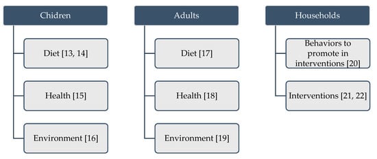 Not enough is known about the nutritional status and dietary intake in the diverse array of low-resource and food insecure groups despite summary information regarding the broad group of U.S. children and adults. Some of these subsets may be missed in national surveillance for reasons such as limited samples to make robust estimates, non-response or attrition [8,9]. Nor are the environments and nutritional barriers of the diversity of vulnerable population groups affected by food insecurity and low resources fully understood [10,11]. Creating interventions that effectively intervene to improve food security and nutritional status, however, are dependent on this knowledge as broad, summary information may not translate to a one-size-fits-all approach to improve food security in such a varied food landscape. Tailored approaches to quantify access to food, the nutrition environment, dietary behaviors and other barriers are necessary to identify the needs in diverse populations and then to build successful interventions that will improve dietary intake, reduce rates of chronic disease and counter negative factors in the environment [12]. In order to begin to fill this gap, this Special Issue on “Nutrition Among Vulnerable Populations” features papers quantifying dietary intake, nutritional status, access to food and food security, barriers to healthful foods and food security and environmental influences experienced by vulnerable groups with a high prevalence of food insecurity. The following sections summarize the findings of the four papers on children [13,14,15,16], three papers on adults [17,18,19] and three papers featuring studies of families or households (Figure 1) [20,21,22].