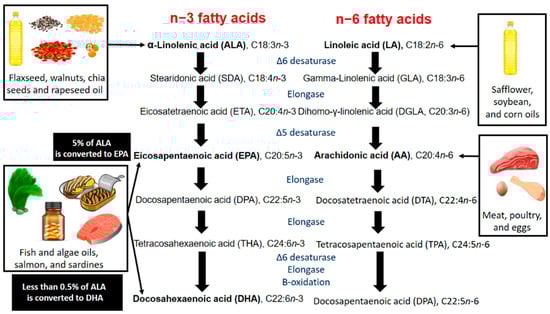 Not only the insufficient intake of dietary n3-PUFAs, but also the inefficient elongation and desaturation of ALA to eicosapentaenoic acid (EPA) and docosahexaenoic acid (DHA) in humans, result in low n3 long chain-PUFA content in blood and other peripheral tissues [