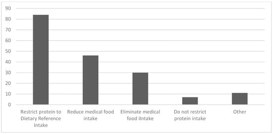To most of the clinicians surveyed, diet liberalization and a “protein-controlled diet” means restricting intact protein intake to the standard reference, defined in this survey as the US Dietary Reference Intake [31], or an equivalent international reference. Yet, to many, it also means reducing the intake of medical food (as is likely to occur as intact protein increases), and to some, liberalization means no restriction of protein.