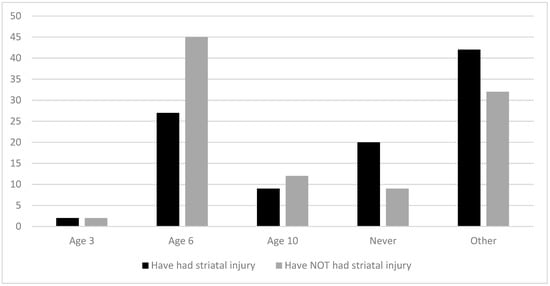 The question “When does your clinic liberalize the diet?” was asked for both patients who have had an acute encephalopathic crisis resulting in striatal injury and those who have not. As seen in Figure 2, the most common answer for both groups was “after age 6 years”, with 27% of respondents recommending diet liberalization for those with striatal injury at this age. Forty-five percent of respondents recommend diet liberalization after age 6 years for patients who have not had striatal injury. Responses ranged from recommending diet liberalization as early as “after age 3 years” (2% of respondents in both groups) to never (20% for those with striatal injury and 9% for those patients who have not had a striatal injury).