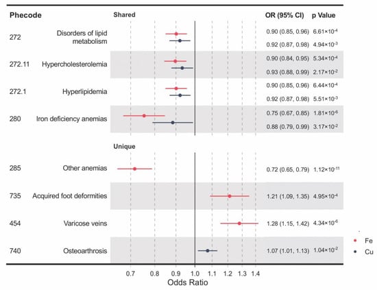 Genetically determined blood levels of iron and copper share some of the associated clinical outcomes, including iron deficiency anemia, disorders of lipid metabolism, hypercholesterolemia, and hyperlipidemia (Figure 2). IVW MR analyses provided significant evidence for causal effects of both higher blood iron and copper on reduced risks of iron deficiency anemia (OR per SD increase in blood iron = 0.75, 95% confidence interval (CI): 0.67–0.85, p = 1.81 × 10−6; OR per SD increase in blood copper = 0.88, 95% CI: 0.79–0.99, p = 0.032) and disorders of lipid metabolism (OR = 0.90, 95% CI: 0.85–0.96, p = 6.61 × 10−4; OR = 0.92, 95% CI: 0.87–0.98, p = 4.94 × 10−3), and its two subtypes, hyperlipidemia (OR = 0.90, CI: 0.85–0.96, p = 6.44 × 10−4; OR = 0.92, CI: 0.87–0.98, p = 5.51 × 10−3) and hypercholesterolemia (OR = 0.90, CI: 0.84–0.95, p = 5.34 × 10−4; OR = 0.93, CI: 0.88–0.99, p = 0.022). Moreover, unique causal clinical effects were identified for iron and copper. Per SD increase in blood iron is associated with enhanced risks of varicose veins (OR = 1.28, CI: 1.15–1.42, p = 4.34 × 10−6) and acquired foot deformities (OR = 1.21, CI: 1.09–1.35, p = 4.95 × 10−4) but with reduced risk of other anemia (OR = 0.72; CI: 0.65–0.79; p = 1.12 × 10−11). Per SD increment in blood copper is associated with an increased risk of osteoarthrosis (OR = 1.07, CI: 1.02–1.13, p = 0.010).