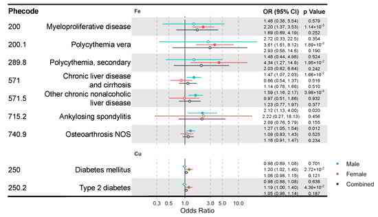 Due to the well-known sex differences in iron and copper status and metabolism [,,,], we additionally performed sex-stratified IVW MR analysis to identify sex-specific clinical effects of these minerals. We identified multiple mineral–outcome pairs exhibiting possible sex-specific causal relationships (Figure 3, Table S8). That is, their MR estimates are significant only in one sex group, but not in the other or the sex-combined sample. Iron is associated with higher risks of myeloproliferative diseases (OR = 2.20, CI: 1.37–3.53, p = 1.14 × 10−3) in females and chronic liver disease (OR = 1.47, CI: 1.07–2.03, p = 0.017) in males. Moreover, copper increases the risk of diabetes mellitus (OR = 1.20, CI: 1.02–1.40, p = 0.027) and its subcategory, type 2 diabetes (T2D) (OR = 1.19, CI: 1.00–1.40, p = 0.044) in females. However, blood iron and copper have no sex-specific effects on lipid metabolism diseases.