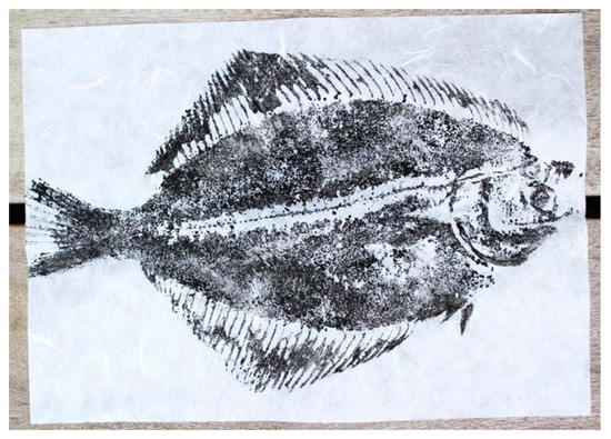 Phase a: Gyotaku (printing): The printing procedure was the actual gyotaku exercise. The children chose and picked up their group’s fish from a box containing fresh fish on ice. The fish was then cleaned by washing it under cold running water while rubbing it with a slice of fresh lemon (this dissolves the fish’s natural mucus cover). The fish was then dried with paper towels and placed on a cutting board. Paper squares were placed around the edge of the fish to avoid getting squid ink on the cutting board. Diluted squid ink was applied with a sponge to the surface of the fish until it was covered with ink. The paper squares around the fish were removed, and printing paper was placed on top of the fish. The print was transferred to the paper by stroking the fish on top of the paper. The paper was gently pulled off the fish, and a mirrored print of the fish had been transferred to the paper (see Figure 2).