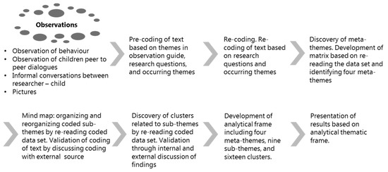 The participant observation was primarily concept-driven [55] and based on the framework of Rozin and Fallon’s [23] and Rozin and Vollmecke’s [27] taxonomy of food rejection and acceptance. Therefore, a loosely structured observation guide, with room for exploratory inquiry, was constructed based on the main framework of acceptance and rejection with the following themes: (1) the social/group interaction element, (2) the children’s interaction with the fish, (3) the process of the exercise, and (4) development/changes in attitude throughout the experiment. Documentation methods used during the participant observation were in the form of written field notes and situational photos to document the setting, various situations, and child–fish interactions. The field note strategy was inscription and transcription [55], in which descriptions of behaviours (inscriptions) and informants’ own words and dialogues (transcription) were recorded in an observational journal based on the loosely constructed and pre-thematised observational guide.