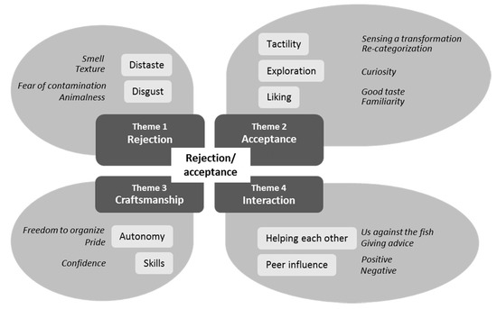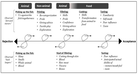 Rejection based on distaste, which includes all sensory characteristics, both real or imagined [25,26], was based on two main sensory characteristics: smell and texture. Rejection based on smell was primarily present in two phases of the experiment. Firstly, at the beginning of the printing phase when the children were presented with the fresh fish: