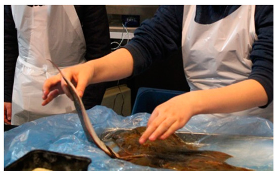 The same researcher participated in all gyotaku exercises by observing and interacting with the children through informal conversations based on the observation guide. In all cases except two (school MB and MD), observation assistants were present throughout the gyotaku exercise. At schools SA, SB, SC, three observation assistants were present, and at school MC one observation assistant was present. In all cases, the observation assistants had a semi-participatory role while also documenting the gyotaku exercise through photos. During the participant observations, researchers and assistants interacted with the children through informal conversations based on the situation while the children were working with the fish. Questions were based on “free narrative” [56] to promote situational comfort and to get and keep the conversation flowing. The questions were directed towards the children’s perspectives of the situational experiences; for example (to the whole group): “How is it going here?” and “How do you feel about filleting a fish?”. Probing [53] was used to follow up on short answers, for example “Can you tell me some more about that?”. The focus was on informality and conversations steered by the children and their point of view. If a child asked what had been written down during a conversation, he/she was given the opportunity to read it. After each observation session, observational journals and photos were compared and evaluated. Post-intervention notes were documented by the research group. Furthermore, the field notes in the observational journal were immediately after the observation separated into direct observations of behaviour, dialogues based on children’s peer-to-peer dialogues and researcher–child dialogues, and researcher reflections. A pre-coding was conducted based on concept-driven coding [55]; for example based on the framework of acceptance and rejection [25,27], fish handling, sensory aspects, and group work.