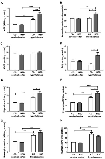 Brain oxidative damage (advanced glycation end products (A), Amadori products (B), advanced oxidation protein products (C), protein carbonyls (D), dityrosine (E), kynurenine (F), N-formylkynurenine (G) and tryptophan (H)) in the control and HSD-fed rats. Values are means ± SEMs; n = 10 * differences statistically important at p < 0.05, ** p < 0.005, *** p < 0.0005 and **** p < 0.0001. AGE—advanced glycation end products; AOPP—advanced oxidation protein products; CD—control diet; HSD—high-sucrose diet; PC—protein carbonyls.