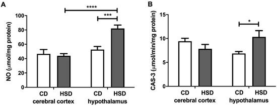NO and CAS-3 were higher only in the hypothalamus (+56% and +50%, respectively) of HSD rats when compared to the controls (Figure 6). Moreover, the NO content was significantly higher (+87%) in the hypothalamus of HSD animals compared to the cerebral cortex.
