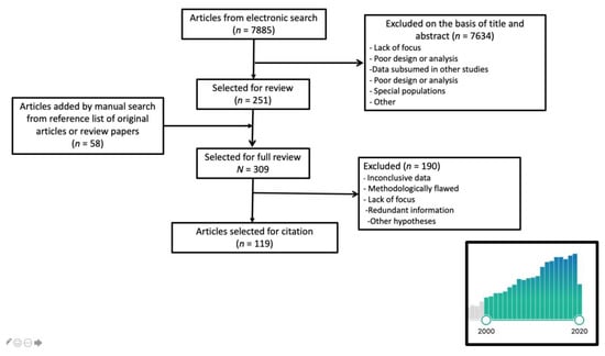 Literature search flowchart. The bars in the insert represent the trend in the numbers of papers published per year between 2000 and 2020. The year 2020 is incomplete because the search only included papers published until 1 October.