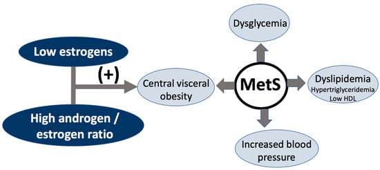 The potential contribution of hormonal changes other than those in estrogens has been studied in depth, with the case of polycystic ovary syndrome (PCOS) providing a good model [15]. Proof of the specific potential of hormones has been found in non-obese women presenting with PCOS, who also show an increased risk of MetS [16]. A relative increase in androgens vs. estrogens has been attributed a central role, although the issue is still a matter of some debate [17]. For example, androgen concentrations did not increase the risk for diabetes among overweight women who were already glucose intolerant in a secondary analysis of the Diabetes Prevention Program (DPP) and the Diabetes Prevention Program Outcomes Study (DPPOS) [18]. It might be that androgens distinct from testosterone, such as dehydroepiandrosterone-sulfate (DHEAS), could have a compensatory effect [19,20].