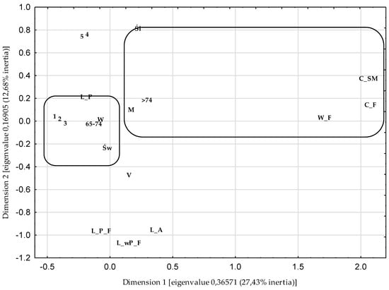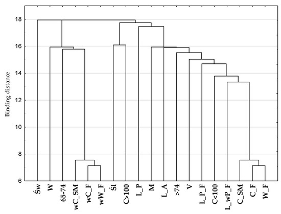 The structures of the relationships between the variables describing the perception of food insecurity, taking into account long distances from the places of purchasing food to the places of residence, and socio-demographic features are presented in Figure 2. Using Ward’s hierarchical classification method, two collections were selected. One collection consisted of people who declared a lack of a sense of food security in their households (W_F, C_F, and C_SM) and at the same time were characterized by features such as: men, aged 75 and more, and living in the Śląskie Voivodeship. This collection includes all categories of the variable: place of residence and household structure. The second collection included those respondents who declared food security (wW_F, wC_F and wC_SM). They were women, people aged 65–74 and people living in the Świętokrzyskie Voivodeship.
