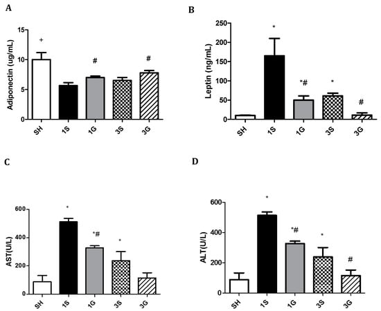 Plasma levels of (A) adiponectin, (B) leptin, (C) AST and (D) ALT among the sham group and experimental groups on days 1 and 3 after a sleeve gastrectomy. Data are presented as the mean ± SEM. AST, aspartate aminotransferase; ALT, alanine aminotransferase. SH, sham group; 1S, saline-injected group sacrificed 1 day after the gastrectomy; 1G, GLN-injected group sacrificed 1 day after the gastrectomy; 3S, saline group sacrificed 3 days after the gastrectomy; 3G, GLN-injected group sacrificed 3 days after the gastrectomy. n = 8 for each group. Differences among groups were analyzed by a one-way analysis of variance (ANOVA) followed by the Bonferroni post-hoc test. + Significantly differs from the gastrectomy groups. * Significantly differs from the SH group. # Significantly differs from the S group at the same time point (p < 0.05).