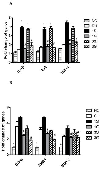 Messenger RNA expression of (A) inflammatory cytokines and (B) macrophage infiltration markers in epididymal fat tissues. IL-1β, interleukin-1β; IL-6, interleukin-6; TNF-α, tumor necrosis factor-α; EMR-1, epidermal growth factor-like module-containing mucin-like hormone receptor-like 1, MCP-1, monocyte chemoattractant protein-1. NC, normal control group (n = 6). SH, sham group; 1S, saline-injected group sacrificed 1 day after the gastrectomy; 1G, GLN-injected group sacrificed 1 day after the gastrectomy; 3S, saline group sacrificed 3 days after the gastrectomy; 3G, GLN-injected group sacrificed 3 days after the gastrectomy. n = 8 for the SH and gastrectomy groups. Values are presented as the mean ± SEM. Differences among groups were analyzed by a one-way analysis of variance (ANOVA) followed by the Bonferroni post-hoc test. + Significantly differs from the other groups. * Significantly differs from the NC and SH groups. # Significantly differs from the S group at the same time point (p < 0.05).