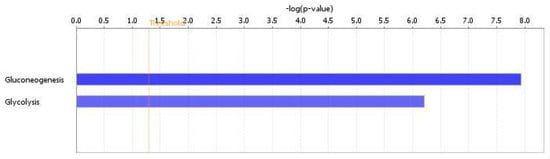 Comparison of canonical pathways between the 3S and 3G groups. Only two different pathways were shown to be related to glucose metabolism. The vertical line indicates a threshold of p < 0.05. Significant canonical pathways were determined by an ingenuity system pathway analysis. The x-axis displays the negative log of the p value calculated by Fisher’s exact test. The gluconeogenesis pathway is shown in a deeper blue color, indicating greater significance than the glycolysis. p values of gluconeogenesis and glycolysis were 1.5 × 10−8 and 6.12 × 10−7, respectively.