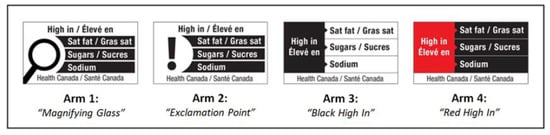 This five-arm (control: current regulated nutrition labeling with no FOPL; four FOPL design arms added to current regulated nutrition labeling; Figure 1) retail experiment made use of a retail food lab to emulate a food shopping experience. The four FOPL arms were designs that had been put forward by Health Canada in their national consultation on FOPL [37]