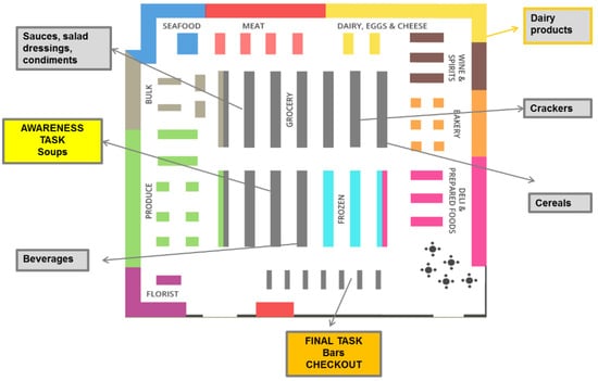 The entire study was conducted between February and March 2018 in the CRO’s retail food lab located in the Greater Toronto area (Ontario, Canada). The retail food lab was customized to replicate a retail food shopping experience, including typical retail grocery shelving containing a variety of food product categories, grocery carts, and a check-out lane (Figure 2).