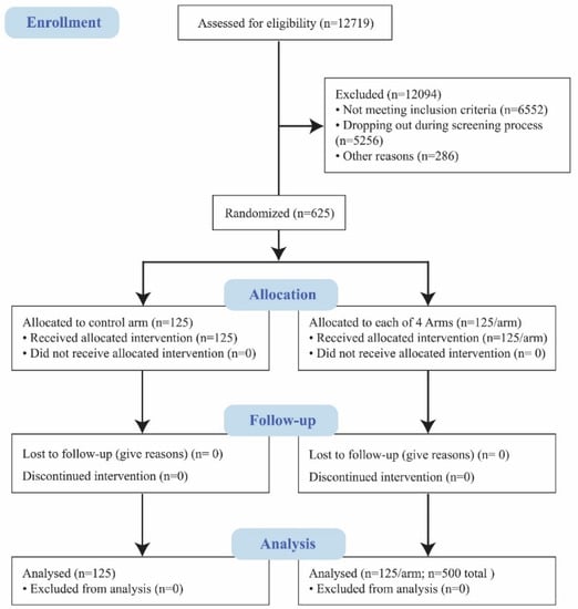 A total of 12,719 participants were contacted and screened for the eligibility criteria. Of these, 12,094 were excluded for not meeting the eligibility criteria (n = 6552), dropping out during the screening process (n = 5256), not meeting quality control (i.e., not being able to wear the eye-tracking glasses) (n = 271) or lack of consent (n = 15) (Figure 3).