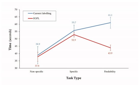 Shopping success rates and decision-making times also varied with the complexity of the task (Figure 4). Participants took significantly more time (approximately 15 s) to make successful food choices to meet a specific dietary goal/need (specific task) than intrinsically motivated tasks (non-specific tasks) (p < 0.0001). Successful decision-making time for the control group increased with complexity of shopping tasks (i.e., specific and findability tasks). Time to successfully complete the non-specific and specific tasks was not statistically different between control and FOPL arms. However, those in the FOPL arms took significantly less time (approximately 17 s) to find foods high in saturated fat, sugars, and/or sodium (findability tasks) compared to control (current labeling).