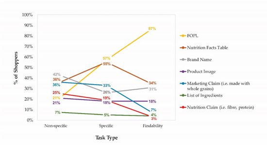 Among all FOPL arms, self-reported consumer reliance on the FOPL to make successful food choices increased as the cognitive burden of the tasks increased (i.e., specific and findability tasks) while reliance on nutrition and marketing claims decreased. Industry labeling (brand name and marketing claims) was relied on more frequently when performing non-specific food tasks (Figure 6).