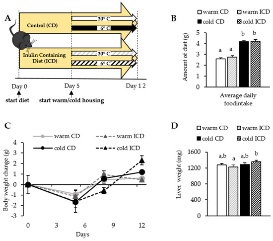 Short-term inulin supplementation does not alter body weight. (A) Study design: C57BL/6J mice were fed an inulin containing diet (ICD) or a respective control diet (CD) for 12 days, and were housed at 30 °C (warm) or 6 °C (cold) for seven days; (B) average daily food intake; (C) body weight change over time, and (D) liver weight after 12 days of feeding. Data are shown as mean values ± SEM; CD warm: n = 6; ICD warm: n = 6; CD cold: n = 6; ICD cold: n = 5; different letters indicate significant differences between groups (p < 0.05) determined by two-way ANOVA.