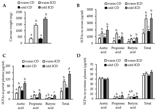 Inulin supplementation increases SCFA levels. (A) Cecum weight; SCFAs in (B) cecal content, (C) portal plasma and (D) systemic plasma. Data are shown as mean values ± SEM, and different letters indicate significant differences between groups (p < 0.05) determined by two-way ANOVA. CD warm: n = 6; ICD warm: n = 6; CD cold: n = 6; ICD cold: n = 5 (ICD cold cecal content n = 4). SCFAs: short chain fatty acids.