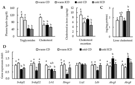 Inulin supplementation alters cholesterol handling. (A) Plasma lipids; (B) cholesterol levels in feces; (C) liver cholesterol levels and (D) relative expression of genes related to cholesterol metabolism normalized to Tbp as the housekeeper in livers. Data are shown as mean values ± SEM, and different letters indicate significant differences between groups (p < 0.05) determined by two-way ANOVA. CD warm: n = 6; ICD warm: n = 6; CD cold: n = 6; ICD cold: n = 5 (ICD cold plasma lipids n = 4).