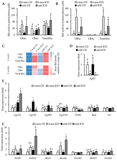 Inulin alters the bile acid metabolism. (A) UBA, CBA, and total bile acid levels in portal plasma and (B) systemic plasma, and in feces (C). Relative expression of (D) Fgf15 in ilea; (E) genes involved in the synthesis of bile acids and its regulation in the liver. (F) Genes involved in the hepatic transport of bile acids. Levels are normalized to Tbp as the housekeeper. Data are shown as mean values ± SEM, and different letters indicate significant differences between groups (p < 0.05) determined by two-way ANOVA. CD warm: n = 6; ICD warm: n = 6 (ICD warm BA portal plasma n = 5); CD cold: n = 6 (CD cold BA systemic plasma n = 4); ICD cold: n = 5. VBA: urine bile acids, CBA: conjugated bile acids.