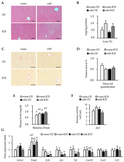 Inulin does not cause definite signs of liver damage. (A) H&E-stained (scale bar = 100 μm) sections of livers (B) and liver TG levels. (C) Sirius Red stained sections of livers (scale bar = 200 μm), including Sirius Red quantification (D). (E) Plasma levels of bilirubin; (F) plasma ALT enzyme activity; (G) relative hepatic expression of genes associated with liver damage, inflammation, or immune cell infiltration normalized to Tbp as the housekeeper. Data are shown as mean values ± SEM, and different letters indicate significant differences between groups (p < 0.05) determined by two-way ANOVA. CD warm: n = 6; ICD warm: n = 6 (ICD warm bilirubin and ALT n = 5); CD cold: n = 6 (CD cold bilirubin and ALT n = 5); ICD cold: n = 5.