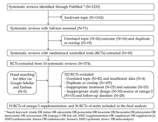 We used PubMed to retrieve systematic reviews with or without meta-analysis. On 22 December 2019, the following terms were searched without language restriction: statin, omega-3 supplementation, cardiovascular disease, systematic review, and meta-analysis. The RCTs from relevant systematic reviews were then assessed for eligibility criteria. We incidentally searched for relevant RCTs published after the cut-off date for inclusion in previous systematic reviews.