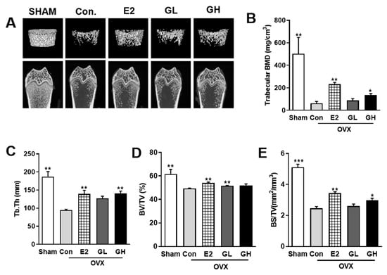 3.2. GTE Prevents Weight Gain and Increases Bone Mass in OVX Rats