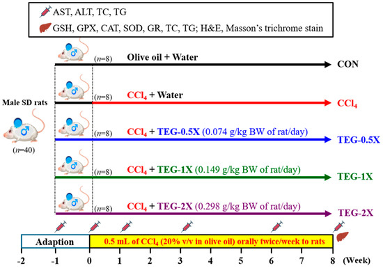 Forty SD rats were randomized into five groups (n = 8 per group): olive oil (CON), CCl4 per oral (p.o.), and dietary supplementation with TEG doses of 0.074, 0.149, and 0.289 mg/kg body weight (BW) plus CCl4 (TEG-0.5X, TEG-1X, and TEG-2X, respectively). The detailed experimental design is illustrated in Figure 1. After 1 week of olive oil (CON and CCl4 groups) or TEG treatment, the CCl4, TEG-0.5X, TEG-1X, and TEG-2X groups were orally administrated with CCl4 dissolved in olive oil twice a week (20% CCl4 in olive oil, 0.5 mL/rat) while the control group (CON) group was orally administrated with olive oil only (0.5 mL/rat). Moreover, the 0.5X, 1X, and 2X groups were continuously treated with TEG, whereas the CON and CCl4 groups were treated with olive oil every day. TEG was treated after 1 h of CCl4 administration to avoid the interaction with CCl4 [13]. The purchase and storage of CCl4 followed the Chemical Management System of National Taiwan Sport University for toxic chemical substances. The food and water intake were monitored daily and the rats were weighed to determine their body weight every week.