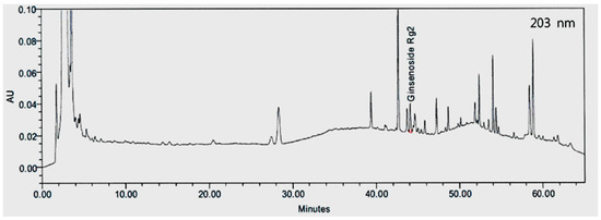 The retention time of ginsenoside Rg2 was 44.1 min (Figure 2). Based on the calibration curve, the content of total ginsenoside Rg2 in the TEG was 0.88 mg/g.