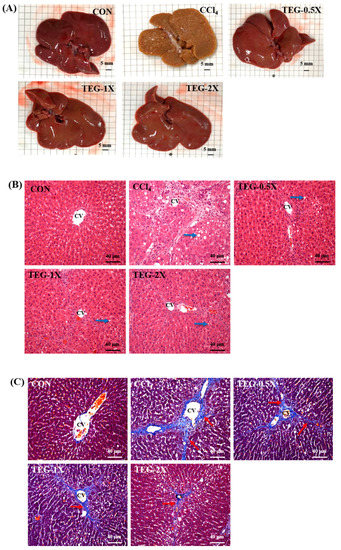 Characteristic livers after traditional essence of ginseng (TEG) supplementation with carbon tetrachloride (CCl4)—induced liver damage: (A) macroscopic characteristic of livers in CON, CCl4, and TEG supplemented groups (CCl4, TEG-0.5X, TEG-1X, and TEG-2X) (Scale bar, 5 mm). (B) H&E stain of liver tissues in CON, CCl4, and TEG supplemented groups (CCl4, TEG-0.5X, TEG-1X, and TEG-2X). CV: central vein, blue arrows mark vacuoles caused by steatosis (magnification: ×200; scale bar: 40 μm). (C) Masson’s trichrome stain of liver tissues in CON, CCl4, and TEG supplemented groups (CCl4, TEG-0.5X, TEG-1X, and TEG-2X). CV: central vein, red arrows mark collagen fibers. (magnification: ×200, scale bar: 40 μm).