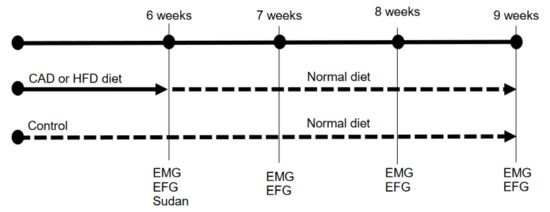 Timeline of the experimental procedure. CAD, cafeteria diet; HFD, high-fat diet; EMG, electromyography (endplate noise recordings); EFG, electrophysiology (intracellular recordings).