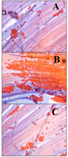 The LAL muscle is a flat, thin muscle that does not require microtomy. Whole LAL muscles were immersed in the Sudan III preparation (50 mL of 50% alcohol, 50 mL acetone, 1 g Sudan III—Sigma-Aldrich, Steinheim, Germany) for 5 min. After cleaning the excess dye with 50% alcohol, a methylene blue contrast stain was performed (1 min). After washing off the excess under tap water, it was mounted on glycerin for visualization.