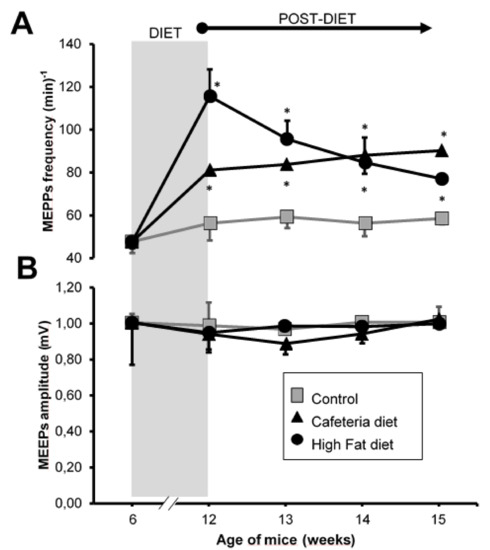 Intracellular recordings. (A) Frequency of miniature endplate potentials (MEPPs) expressed as number of events per minute. (B) Mean amplitude of the MEPPs expressed in mV. Grey area, period in which the animals were exposed to the CAD or HFD diets. Values are expressed as the mean ± SEM. For each experimental series, N = 4 animals. * p < 0.05 with respect to control values. Cafeteria diet group, CAD. High-fat diet group, HFD.
