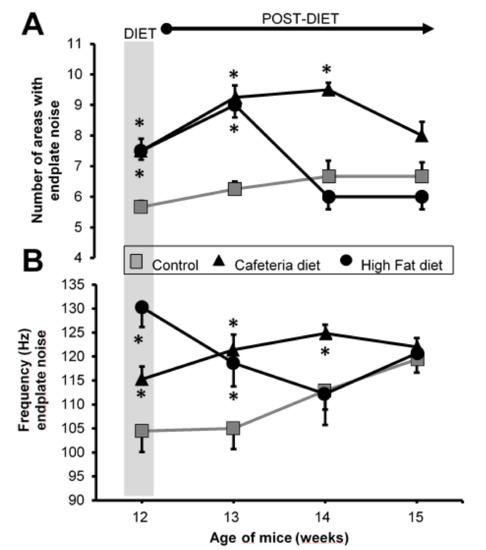 Electromyography. (A) Number of average areas with plate noise. (B) Each area with endplate noise was analyzed by quantifying the number of events/s (Hz). Grey area, end of the period in which the animals were exposed to the diets. Values are expressed as the mean ± SEM. For each experimental series, N = 8 gastrocnemius muscles from 4 animals. * p < 0.05 with respect to control values.