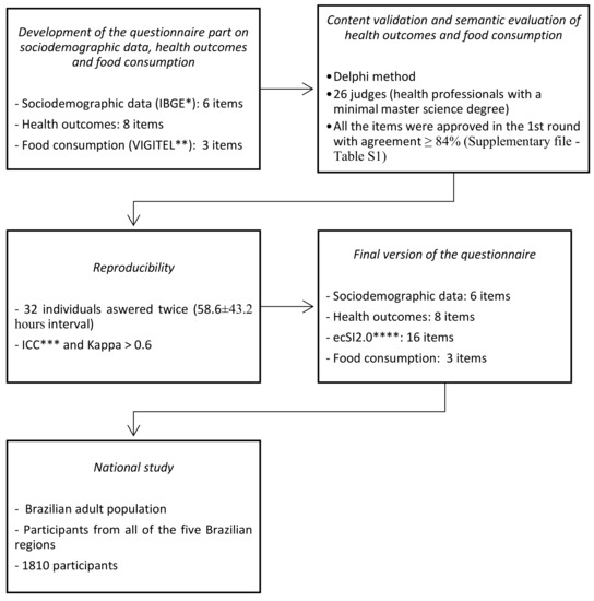 The steps of constructing and validating the complete questionnaire, composed of the ecSI2.0™BR, sociodemographic data, health outcomes, and food consumption, are described in Figure 1. The final version of the questionnaire was composed of 33 items (Appendix A).