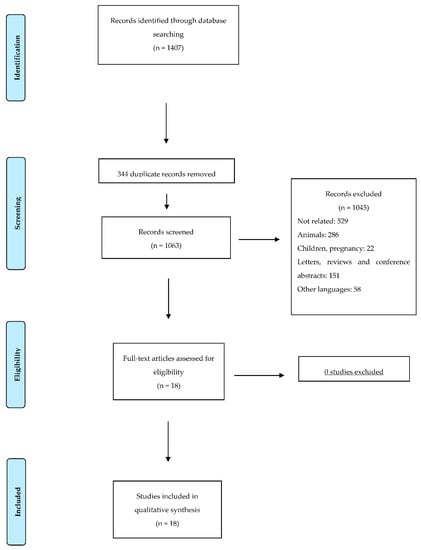 We removed all articles written in languages other than English, duplicated records, reviews, conference abstracts and letters, studies on a pediatric population, studies on animals and unrelated articles, resulting in 18 eligible studies (Table 2). This is illustrated as a flow-chart according to the PRISMA statement in Figure 1.