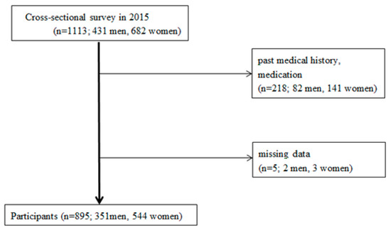 Our study was a cross-sectional analysis of data from the 2015 Iwaki Health Promotion Project. The Iwaki region of Hirosaki City is in the Aomori Prefecture, Northern Japan. A total of 1113 adults (431 men and 682 women) participated in the project. Participants ranged from 20 to 91 years of age with a mean age of 54.5 ± 14.2 years. We excluded participants with current or past use of drugs that influence neutrophil function and ROS. Specifically, the exclusion criteria were: (1) history of hypertension, hyperlipidemia, diabetes mellitus, allergies, cerebrovascular disease, cardiovascular disease, post-orthopedic surgery, rheumatoid arthritis, schizophrenia, or depression; (2) currently taking any steroid, anti-inflammatory drug, anti-allergy drug, sex steroid hormone, anti-rheumatic drug, antibiotic, osteoporosis medication, laxative, or proton-pump inhibitor; or (3) missing data. In total, 895 participants (351 males and 544 females) were included in the analyses (Figure 1). Participants were divided into 6 groups based on sex (male/female) and age group, including those less than 45 years old (young), 45–64 years (middle-aged), and 65 years or older (old). The resulting groups were: male, young (n = 136); male, middle-age (n = 133); male, old (n = 82); female, young (n = 159); female, middle-age (n = 228); and female, old (n = 157). We prepared this study according to the Strengthening the Reporting of Observational Studies in Epidemiology Statement (STROBE) checklist [22]. All participants provided written informed consent, and the institutional review board of the Hirosaki University Graduate School of Medicine’s Medical Research Ethics Committee approved the study (Permission Number: 2014-377). This study was conducted in accordance with the Declaration of Helsinki.