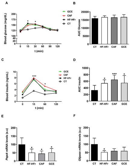 Blood glucose (A), area under the curve (AUC) for glucose (B), plasma insulin (C), and AUC for insulin (D) at different times after oral administration of a glucose solution (2 g/kg body weight). Results are the mean ± SD of values from 10–12 animals/group. Bar plots representing the mean ± SD mRNA levels corresponding to liver Pepck (E) and G6Pase (F) genes from CT (n = 5), HF-HFr (n = 6), CAF (n = 6) and GCE (n = 6) experimental groups. * p < 0.05; *** p < 0.001 vs. control.