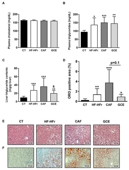 The hepatic TG concentration was also increased in the HF-HFr group versus the CT group, and neither CAF or GCE attenuated this increase. Interestingly, hepatic TG levels were significantly lower in the GCE group than in the CAF group (Figure 2C). The same trend was observed in the liver sections stained with H&E and ORO, although the difference between the GCE and CAF groups was only marginally significant (p = 0.1) (Figure 2D–F).