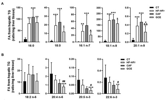Fatty acid composition of hepatic triglycerides. (A) Saturated and monounsaturated fatty acids and (B) polyunsaturated fatty acids in the hepatic triglyceride fraction from CT, HF-HFr, CAF, and GCE experimental groups. Results are the mean ± SD of values from 9–10 animals/group. * p < 0.05; ** p < 0.01; *** p < 0.001 vs. control. # p < 0.05; ## p < 0.01 vs. HF-HFr group. & p < 0.05; && p < 0.01 vs. CAF group.