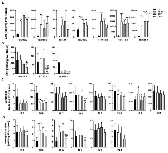 Lipidomic analysis in rat liver homogenates. Levels of diacylglycerols (DAG) (A,B), ceramides (Cer) (C), and hexosylceramides (HexCer) (D) in CT, HF-HFr, CAF, and GCE experimental groups. Results are the mean ± SD of values from 9–10 animals/group. * p < 0.05; ** p < 0.01; *** p < 0.001 vs. control. # p < 0.05; ## p < 0.01 vs. HF-HFr group. & p < 0.05; && p < 0.01; &&& p < 0.001 vs. CAF group.