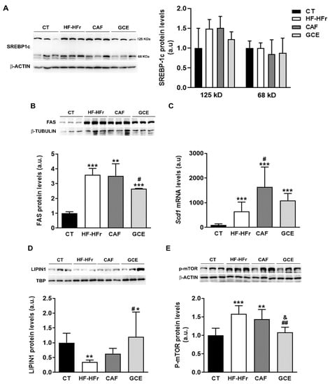Western Blot of precursor (125 kD) and mature (68 kD) SREBP-1c (A) FAS: fatty acid synthase (B) lipin-1 (D) and phospho-mTOR proteins (E) in liver samples. Bar plots represent the mean ± SD band intensity of the proteins obtained from three samples per group, each one pooled from two animals. Bands are shown in the upper part of the figures. (C) Bar plot representing the mean ± SD mRNA levels corresponding to liver Scd1 from CT (n = 5), HF-HFr (n = 6), CAF (n = 6), and GCE (n = 6) experimental groups. * p < 0.05; ** p < 0.01; *** p < 0.001 vs. CT. # p < 0.05; ## p < 0.01 vs. HF-HFr. & p < 0.05 vs. CAF.